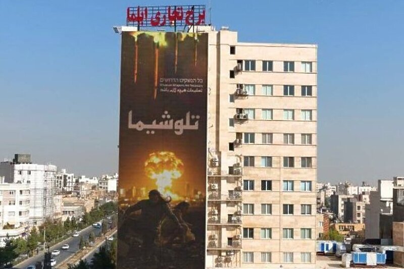 2024. nov. 05. - TELOSHIMA óriásplakát Teheránban a Tel Avivban robbanó atombombával.